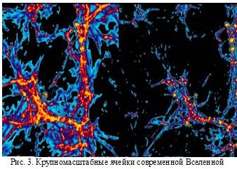 1) крупномасштабные ячеистые структуры, содержащие зародыши галактик и запас первородной энергии;
