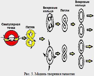 С течением времени в центрах гравитационной конденсации вещества ячеистых пузырей постепенно накапливалась произведённая новая материя. При достижении некоторой критической массы нового вещества возникали их взрывы. В выпуклые стороны ячеек разлетались многочисленные вихри, из которых формировались галактики. Вначале вещество в вихрях было распределено равномерно, с одинаковой плотностью. Однако уже в самой их архитектуре, были сформированы центры конденсации вещества, в которой содержались зародыши звёзд. В процессе стягивания к центрам конденсации вещество концентрировалось в зародыши звёзд и их скоплений, содержащие осколки первородной энергии. В дальнейшем эволюция звёзд способствовала накоплению новых веществ, после чего они взрывались для обновления.