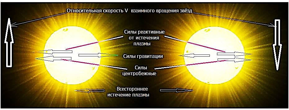 Сторонники Большого взрыва не обратили внимания на космические реликтовые и другие электромагнитные излучения, которые обладают огромной энергией. Взглянем на ту работу, которая совершается этими излучениями. Как известно, гравитационно-связанные звёзды уравновешиваются центробежными силами при их относительном вращении около общего центра тяжести. Кроме того, все горячие космические тела истекают плазмой, тем самым создают всесторонний космический ветер, от которого возникают реактивные силы отталкивания звёзд друг от друга, как бы далеко они ни находились (Рис. 3).