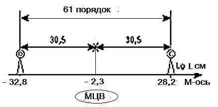 Рис. 28. Масштабный интервал размеров объектов Вселенной [от фундаментальной длины М. Планка 10-32.8 см до расположенной на масштабной оси (М-оси) Метагалактики]. МЦВ – масштабный центр. В начале 70-х годов двадцатого столетия Сергей Иванович Сухонос [6, 7, 8] обнаружил удивительные закономерности масштабного устройства Вселенной.