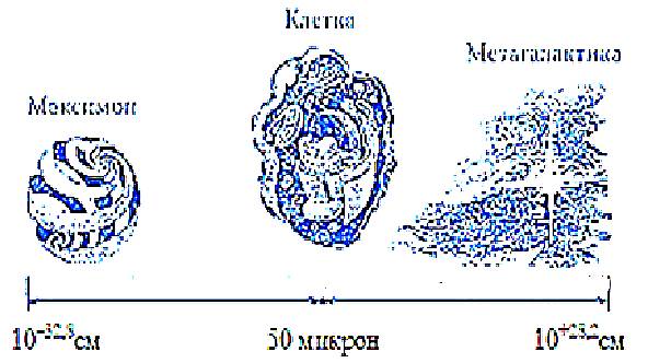 Рис. 29. Масштабные границы Вселенной. В центре масштабного интервала находится живая клетка, которая во столько раз больше мельчайшей частицы Вселенной – максимона, во сколько раз она меньше её верхней границы – Метагалактики.