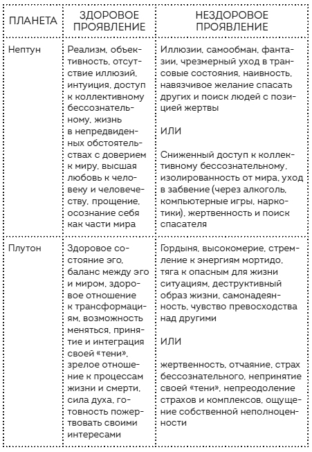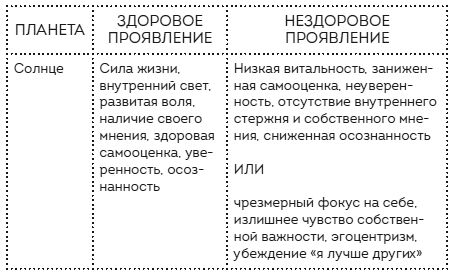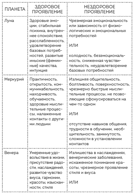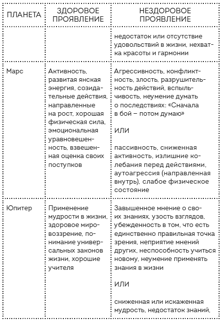 В этой части кратко опишу здоровые и нездоровые проявления планет, знаков и домов в жизни. Нездоровые состояния чаще всего будут проявляться как переход в одну или в противоположную крайность, поэтому я буду описывать их как два полюса.