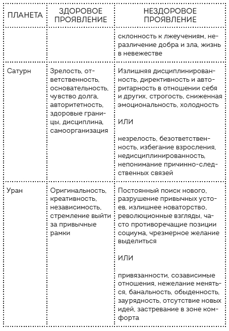 Например, при отрицательном проявлении человек с Солнцем в Овне будет импульсивным, несдержанным, резким, раздражительным, эгоистичным, грубым. Однако, переводя энергии знака в плюс, он будет проявлять свое Солнце в более здоровом варианте. В нездоровом варианте 1-й дом проявится в виде заниженной самооценки, неуверенности, проблем с внешним видом. Но, развивая энергии 1-го дома правильно, человек обретет здоровую самооценку, уверенность, активность, здоровое тело. Энергии Сатурна в минусе будут выражаться в неорганизованности, недисциплинированности, безответственности, незрелости, а раскрывая их в плюсе, вы увидите, как качества планеты начнут проявляться в здоровом состоянии: в виде зрелости, ответственности и самодисциплины.