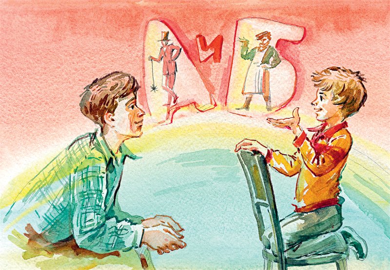 – Вот ты рассуждаешь как раз примитивно, – важно сказал Сережка. – Предположим, «А» – это трубочист, «Б» – печник. Если они оба свалились, как же могло остаться «И»? Это не предмет, его нельзя потрогать или уронить. – Сергей сделал маленькую паузу и хитро улыбнулся. – Но ты тоже прав. Раз ты не сбросил с трубы «И», ты его заметил. Значит, это слово несет важную информацию. А именно: оно обозначает тесную связь между объектом «А» и объектом «Б». Хотя это «И» не предмет, оно существует.