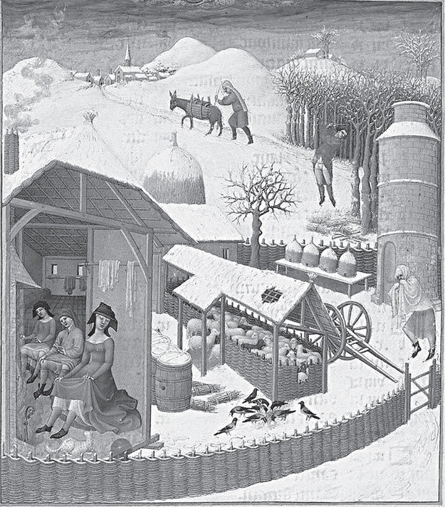 Рассмотрим миниатюру нидерландских живописцев XV века братьев Лимбург из рукописи «Великолепный часослов герцога Беррийского». Миниатюра «Февраль» написана на традиционный сюжет, иллюстрирующий крестьянские будни, – хмурый зимний день, рубка дров, посиделки у очага. На переднем плане – разрез обнесенного забором дома, где, задрав подолы одежд, греются у огня крестьяне. В доме, сушится белье, играет кошка. За забором расположен двор с хозяйственными постройками: загоном для овец, голубятней, ульями. В правой части миниатюры спешит к огню закутанная в платок женщина, а чуть выше – мужчина рубит дрова. На заднем плане изображен подгоняющий ослика крестьянин, по-видимому, направляющийся в расположенную неподалеку заснеженную деревню. Из художественных достоинств миниатюры можно отметить многоплановость, разнообразные ракурсы, неплохо переданный объем и воздушную перспективу.