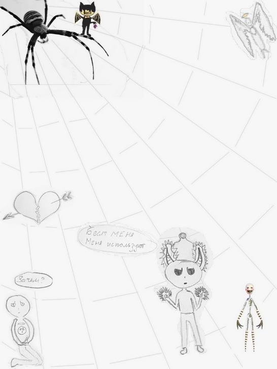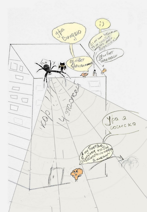 Посторонний наблюдатель заметил бы ещё одну странную особенность. Чем больше девочка обижалась на родителей, тем быстрее паук Виндяй рос. Девочка, конечно, этого не замечала, так как она его сильно любила и не обращала на эти странности никакого внимания. Она сама была готова стать для него мухой, чтобы её любимый Виндяй стал ещё больше. Пока девочка была в школе, паук любил строить со своей паутины чёрные ходы лабиринты с серыми тёмными углами, длинными коридорами, самозакрывающимися ловушками. Он целыми днями и ночами бегал по ним и что-то злобно бормотал. Хотя внешне, несмотря на его чёрный толстый зад, он выглядел вполне симпатично и не вызывал никаких подозрений. Он даже мечтал о своей паучихе.