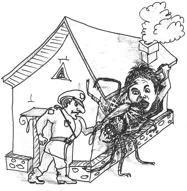 Может бы и погубил всех злой паук, но так как у нас сказочная история, то всё случилось с точностью до наоборот. Однажды, когда паук как обычно бегал по своим тёмным коридорам, за одной из самозакрывающихся дверей неожиданно появился полицейский с огромной мухобойкой в руках. Как он там оказался в сказке об этом ни слова, но сокрушительный удар этой мухобойкой превратил его в мокрое место, из которого только что и торчали дёргающиеся лапки.