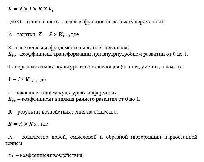 Общий смысл формулы в отражении закономерности – все составляющие должны иметь такие значения, чтобы G (гениальность) стремилась к максимуму. Поэтому применена операция умножения. Важны все компоненты – если хотя бы один равен нулю, то и в результате будет ноль.