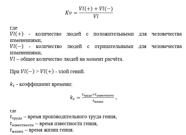 Общий же смысл математической метафоры таков: чем больше результат влияния на общество, чем большим людям творчество гения приносит пользу (или вред), чем дольше известен гений после смерти – тем выше его гениальность.