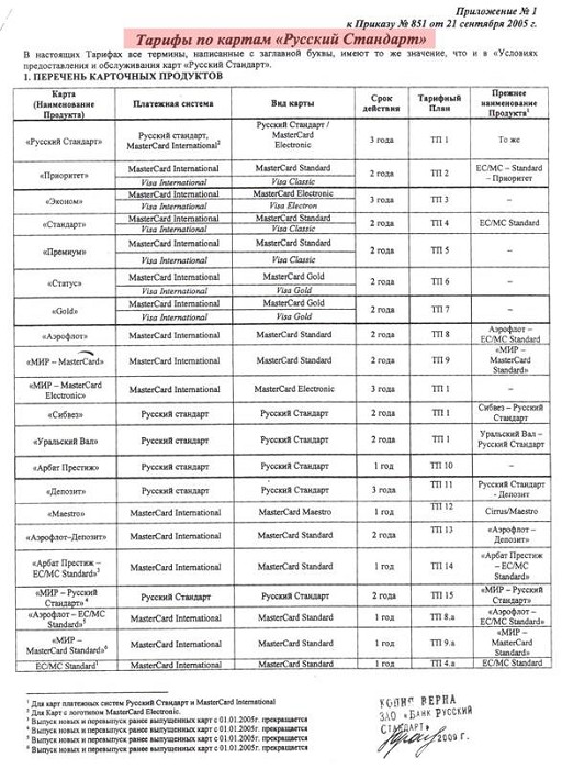 Приказ № 538 от 27.06.2005 (вносит изменения в ТП 1-15, 17-23, 25 ставку Тарифа статьи «Комиссия за сверхлимитную задолженность» равную 0.1% в день, в ТП 1 статью «Коэффициент расчета минимального платежа в размере 4% от суммы лимита карты, признает утратившими силу с 11.07.2005 года, «Тарифы по картам «Русский Стандарт» Приказ №263 от 11.04.2005 года)