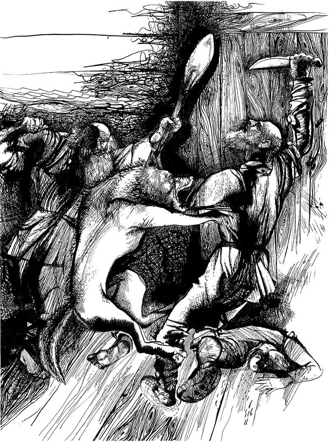 Волк прыгнул и повис у пришедшего на руке. Висел, вцепившись выше локтя и упираясь лапами в бок. Это была рука без ножа. Рука с ножом несколько раз погрузилась в волчью шерсть, но волк продолжал висеть. Он сжал свои челюсти навсегда. И тогда нож выпал. Неживым механическим движением правая рука протянулась на помощь левой. Она схватила волка за загривок и стала отрывать его от страдающей плоти. Морда волка вытянулась, как стаскиваемая маска. Глаза превратились в два белых шара. Они глядели куда-то в потолок и отражали разгоревшуюся лучину.