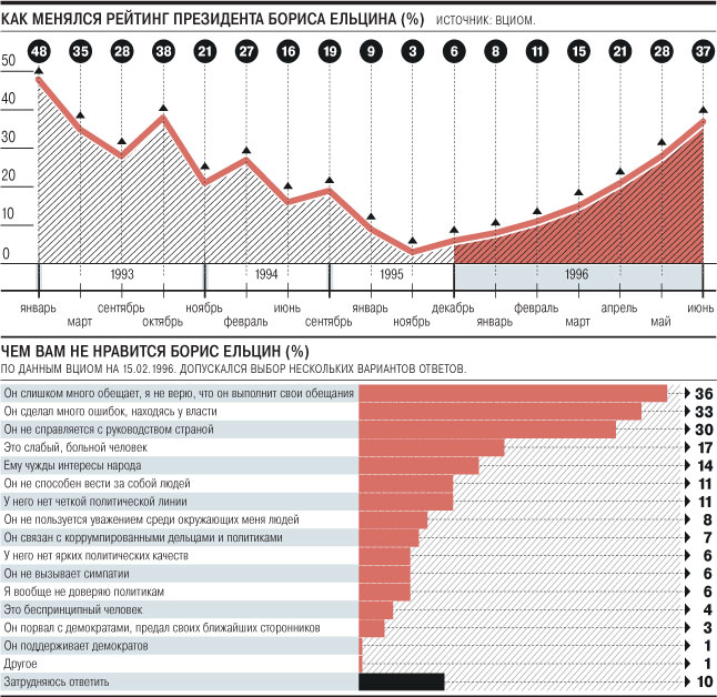 Итак, согласно свидетельству помощников, летом 1995 г. Б.Н. Ельцин начал подготовку к перевыборам, но никаких публичных заявлений на этот счет не делал. Прежде чем объявить о своих намерениях, он должен был убедить новую элиту России в том, что является лучшей кандидатурой на пост президента от «партии власти». А это было сделать непросто, поскольку общественный рейтинг Б.Н. Ельцина на протяжении всего 1995 г. Был очень низким. Согласно опросам, проведенным ВЦИОМ, уровень доверия к Б.Н. Ельцину упал с 6% (январь-февраль) до 4% (ноябрь-декабрь).