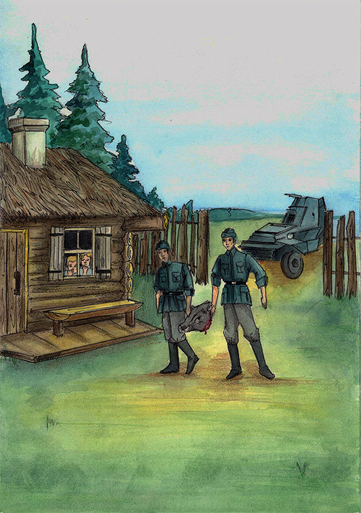 Вскоре из хлева появилась церемония: впереди – наш кабанчик Борька, которого палками погоняли солдаты, а за ними торжественно, с улыбкой на лице – фельдфебель. Дед, наверное, не оставил мысли, что фельдфебель, хоть на обратном пути, но все-таки зайдет в хату и что-то скажет, но…церемония молча проследовала мимо окна и далее – за калитку. Один из солдат погнал Борьку в сторону сосонника, а другой солдат и фельдфебель сели в броневик и последовали за ними.