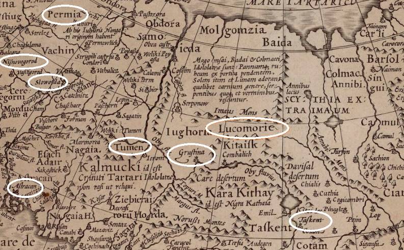 На более позних картах, 1400 годов, прекрасно видно города Грустина (ныне Томск), Тюмень, Пермия, Нижновгород, Слобода и небольшая Астрахань снизу карты. Между Грустиной и Тюменью привычная река Обь.