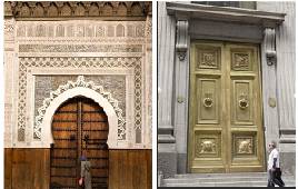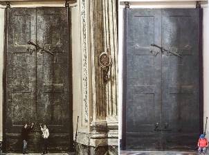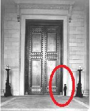 – Здание национального архива США. Две гигантские бронзовые двери, ведущие в круглый зал. Каждая дверь весит шесть с половиной тонн, имеет высоту более одиннадцати метров, ширину три метра и толщину около тридцати сантиметров. Я обвела красненьким, человека современности. И фреска Джованни Фиорини от 1563 года, вполне объясняет, почему строились грандиозные сооружения с дверями, рассчитанными на рост в три с половиной метра и более?