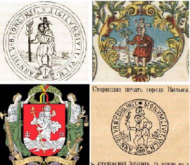 – Герб Вильнюса изображает Святого Христофора и младенца Иисуса на плечах. Впрочем, есть и другое мнение, например, историк Владимир Нарбут в XIX веке писал, что в более ранней версии это был фольклорный великан Альцис и его жена Яутерита. Ну и вырванное с корнем дерево в руке великана заменили на крест, конечно… но кроме Нарбута есть ещё Адам Киркор, археолог и исследователь древностей, который тоже был уверен в языческом происхождении герба Вильнюса. Посмотрите как менялось изображение на гербе.
