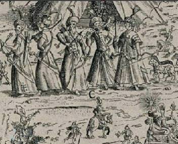 – На этой гравюре изображены торжества, проводимые в Париже, в начале 1612 года, на Королевской площади в честь объявления королевских браков. На гравюре отчётливо видны гиганты, которым лошади высотой до колена.