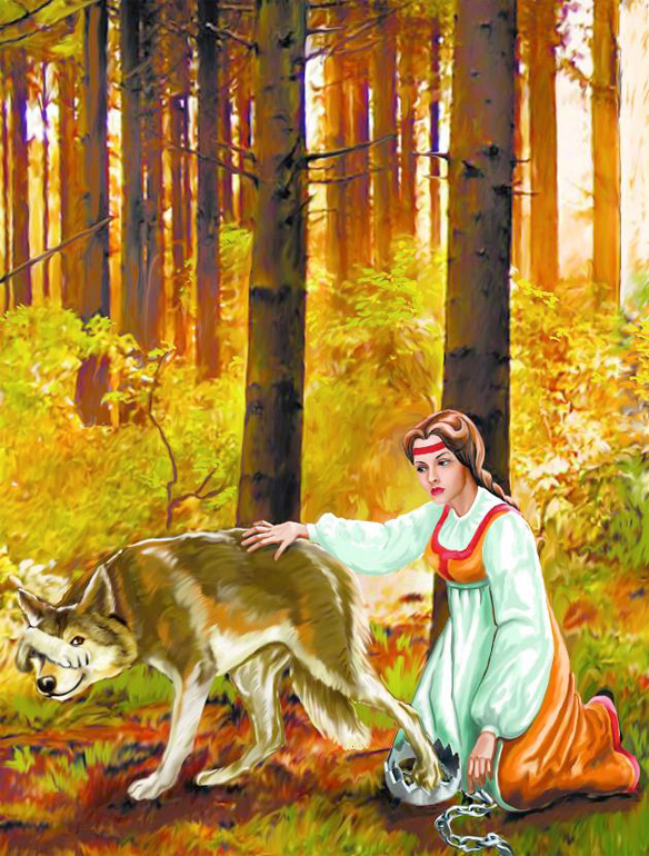 Иллюстрация к сказке о храбром Васе-Васильке и его прекрасной невесте: Настенька вызволяет волка (принца Василия) из капкана.