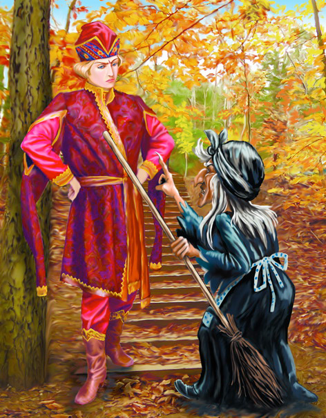 Иллюстрация к сказке о храбром Васе-Васильке и его прекрасной невесте: принц Василий и ведьма.