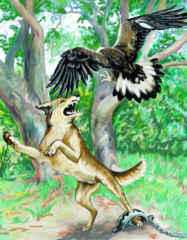 Иллюстрация к сказке о храбром Васе-Васильке и его прекрасной невесте: принц Василий в шкуре волка и орлан.