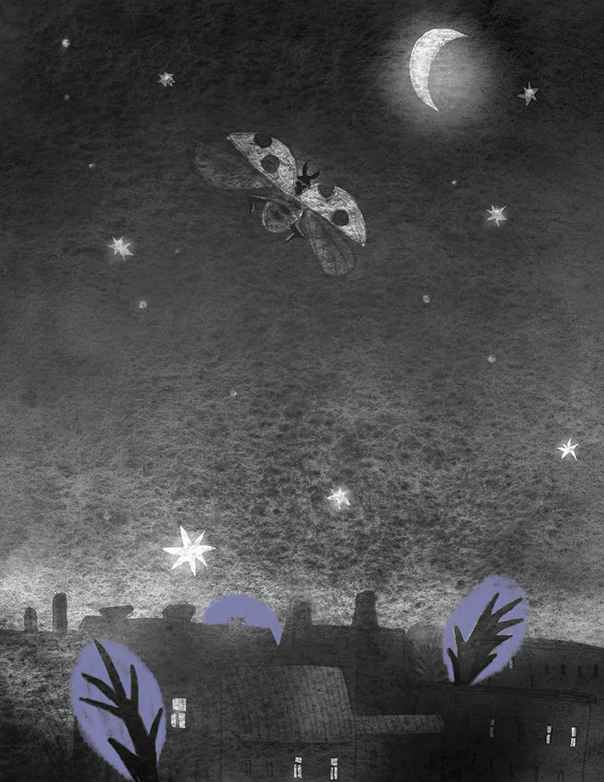 Божья коровка летела всё выше. Всё меньше и меньше под ней становились города и страны. Всё меньше и меньше становились горы и моря. И вот уже большая-большая божья коровка летает вокруг маленького земного шара. Улька засыпала.