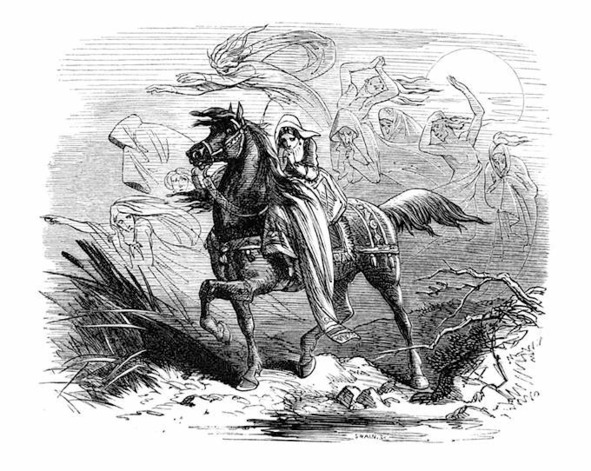 «Поляки уверяют, что Моровая дева разъезжает в двухколесной повозке; а лужичане рассказывают о невидимой колеснице, которая с грохотом носится по улицам в двенадцать часов ночи, и в том доме, возле которого она остановится, непременно кто-нибудь да сделается добычею смерти.…