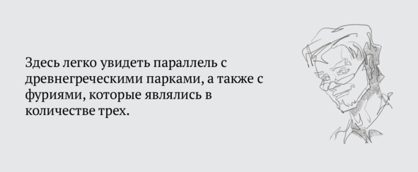 Сходно с этим, новогреческое сказание упоминает о трех страшных женах, которые странствуют вместе по городам и селам и карают жителей моровою язвою: одна носит длинный свиток, где записаны имена приговоренных к смерти; другая – ножницы, которыми наносить людямъ смертельные удары; а третья – веник, которым сметает с лица земли все живое». 15