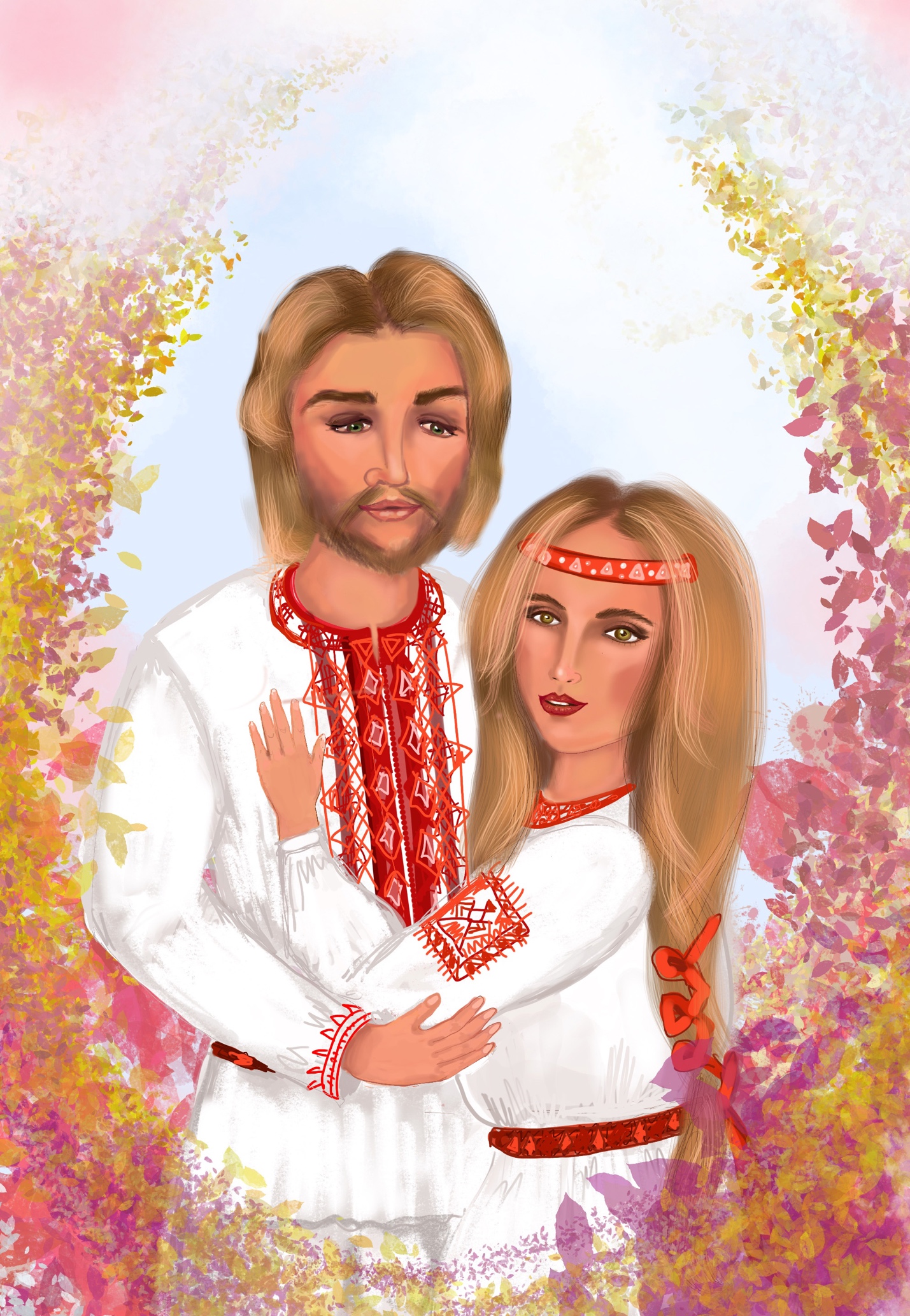 1В тот день солнце купалось в золотых куполах, а из ворот церкви по устланной коврами да цветами диковинными дороге шли со святого венчания счастливые Пётр и Феврония. У избы родичей невесты столы ломились от яств. Матушка с батюшкой встречали хлебом-солью да всех гостей дорогих усаживали.