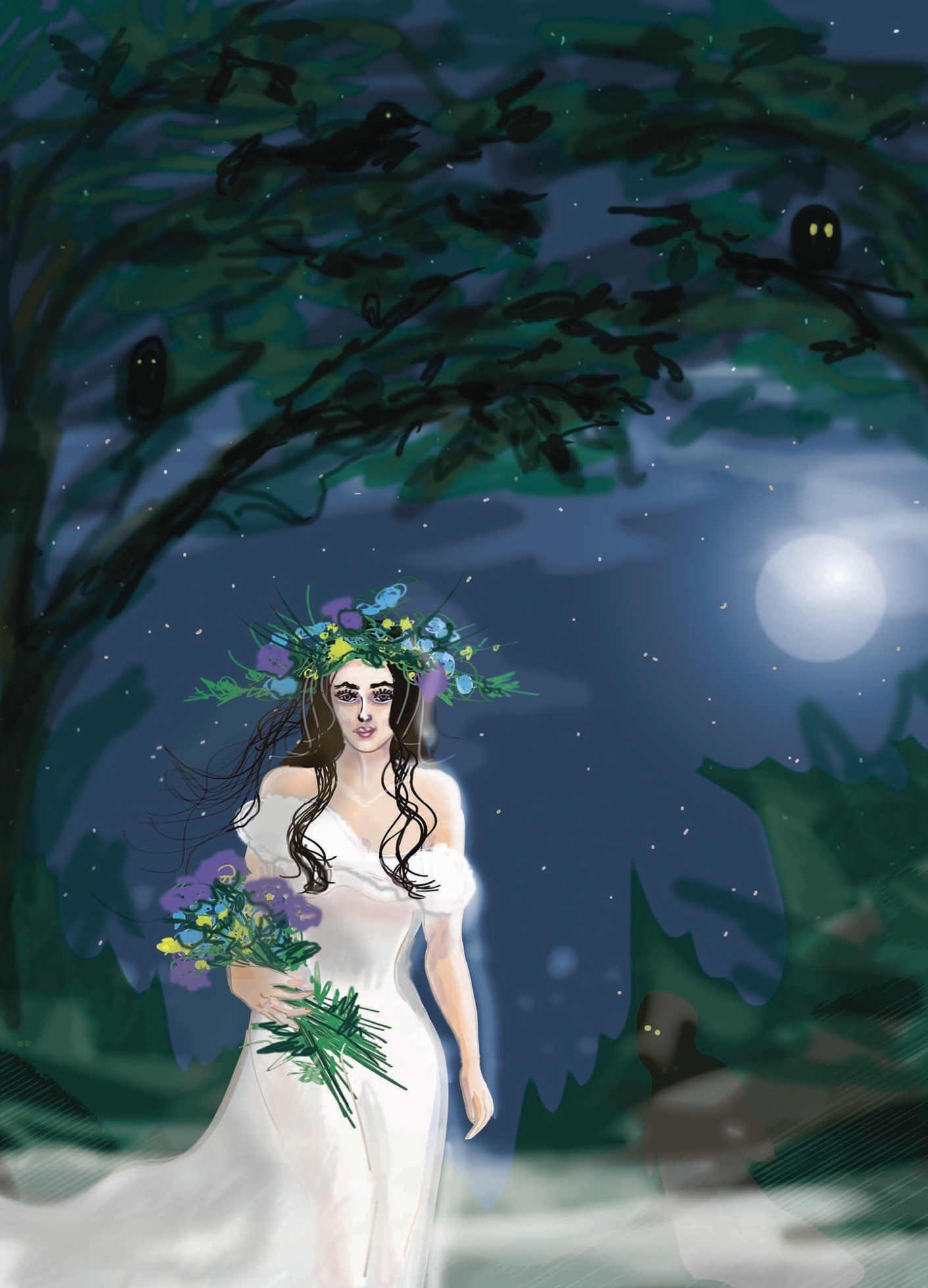 Так и получилось, что принарядилась мавка. Бледность мертвенную закрасила: клюквенным соком губы и щёки подрумянила. А еще веночек из лесных цветов на голову надела. И вышла к деревенскому костру поплясать.
