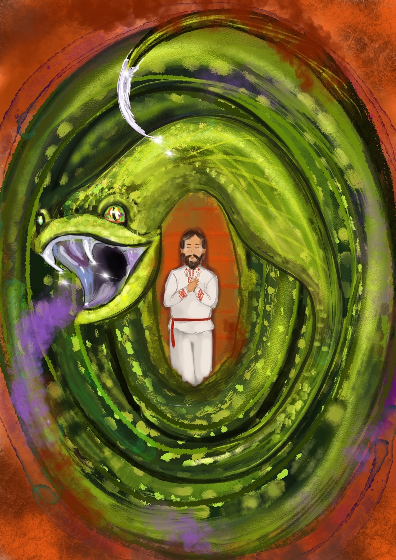 Подплыл Змий к Любаве, к добрым молодцам. Смрадом и нечистью окутало их, еле на ноженьках удержались от вонищи такой. Осмотрел, обнюхал, заклокотал пастью своей премерзкой да смрадной:
