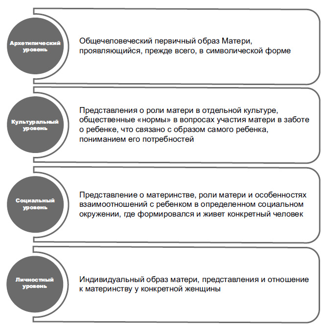 Образ матери многогранен и, как любой сложный феномен, может быть рассмотрен с разных сторон и на нескольких уровнях. Я выделила четыре таких уровня (рис. 1), но, конечно, могут быть и другие способы систематизации.