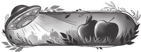 Сквозь ветви яблонь из глубины сада лился свет. Сначала Тайна решила, кто-то разжёг костёр. Однако в дальнем углу сада творилось необъяснимое. Едва касаясь земли, в воздухе парил большой ржавый таз с полупрозрачной светящейся полоской. Рядом с тазом бегал лопоухий жёлтый человечек в полосатом комбинезоне. В руках он держал пылесос, в котором одно за другим исчезали яблоки. Ростом человечек был не больше первоклассника.