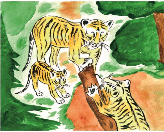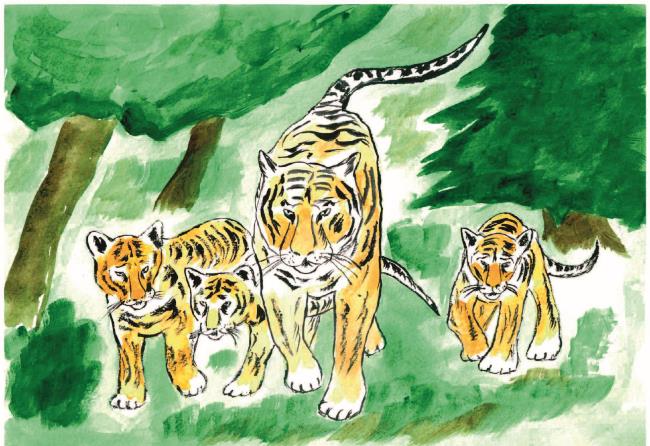 Тигрёнок, про которого я вам расскажу, родился весной в семье амурских (уссурийских) тигров на Дальнем Востоке России – в тайге недалеко от Японского моря. Звали тигрёнка Амба, что значит «большой». Он действительно был намного больше двух своих братьев – Криса и Марса. Пока тигрята были малышами, они вместе со своей мамой-тигрицей жили в непролазных зарослях. Потом тигрята подросли и стали выбираться из чащи в менее густой лес. Мама стала учить своих детей разным вещам, нужным тиграм: охоте, рычанию.