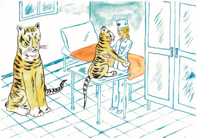 Ближе к вечеру наконец дошла очередь до тигров. Мама-тигрица носом подтолкнула своего сына к доктору. Девушка аккуратно взяла в руки тигрёнка и поставила его на стол. Она очень внимательно осмотрела малыша и не нашла никаких отклонений: тигрёнок был совершенно здоров.