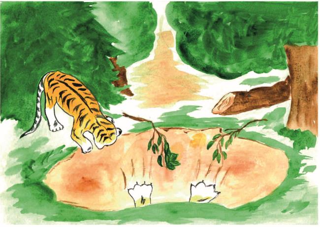 Маленький тигрёнок стал лихорадочно соображать, как помочь маме. Вытащить её самому, конечно же, не получится, надо звать на помощь папу. Но как? Амба боялся, что если он отбежит от ямы в поисках логова, где их ждали папа-тигр с братьями, то потом не отыщет это место.