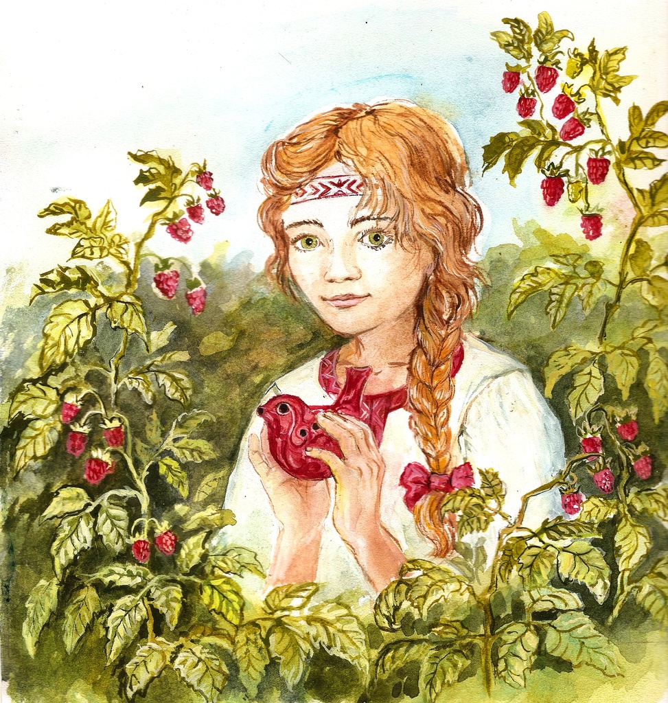 Раскрасневшиеся и запыхавшиеся, они, смеясь, вывалились на поляну. На Малинке был всё тот же мешочек, но кофточка под ним оказалась другая. Не вчерашняя серая, а приятная зелёная. В богатые волосы девочки красиво вплетались жёлтые и голубые мелкие цветочки. Заметив восхищённый взгляд подруги, Малинка закокетничала: