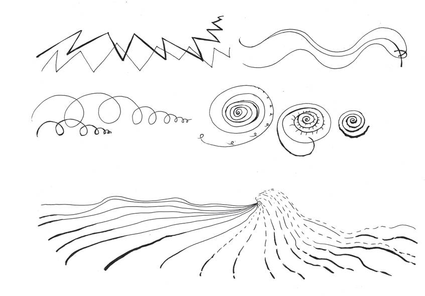 Важно помнить, что на первых этапах рисунка линия определяет размер изображения на листе, его композицию. Один и тот же объект, нарисованный с помощью линии мягкой и волнистой или жёсткой и ломаной, зрительно воспринимается по-разному, приобретая особую художественную выразительность. Посмотрите на эти графические фантазии: это – ветка полыни и волшебная новогодняя ёлка в исполнении сказочника-художника.