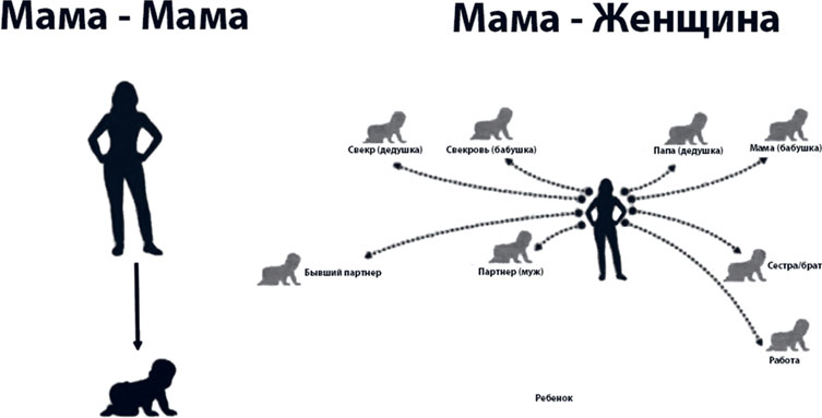 Ваши дети или друзья никак не могут повлиять на вашу роль в системе с работой, например, или бывшими партнерами. Только вы можете влиять на свое место и свой функционал. Не может же ребенок прийти к вам с запросом «Пожалуйста, не разводитесь, потому что я так не хочу». Это очевидный перекос в системе. У ребенка нет такой «должностной инструкции», он не может руководить взрослыми. И точно так же мы, будучи детьми в родительской системе, не можем никак влиять на жизнь Мамы-Женщины. Мы можем быть только ребенком Мамы-Мамы – и все.