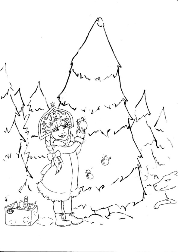 Снегурочка украшает елочку, которая стоит в центре лесной поляны.