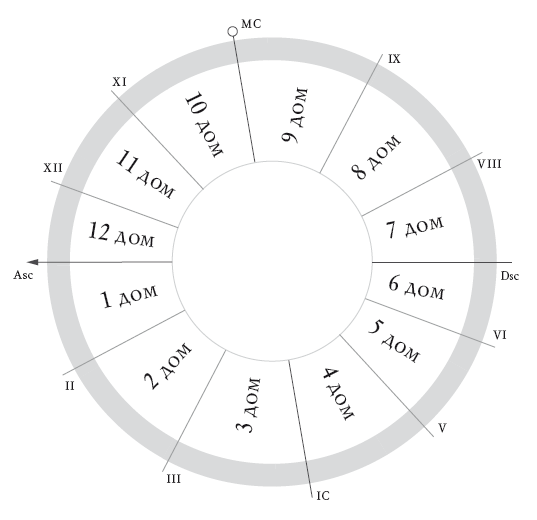 • 12 полей, или домов. Начало каждого дома – куспид – тоже имеет большое значение. Он отвечает на вопросы: как выбирать рабочий график, как зарабатывать деньги и многое другое;