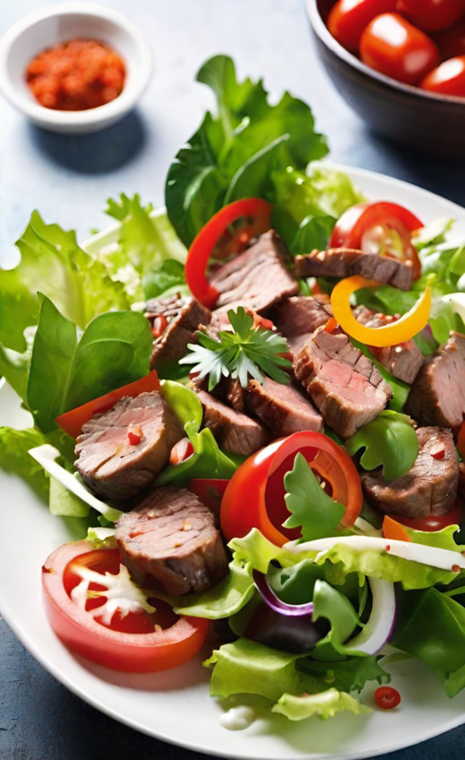 Этот салат «Огненный бифштекс» – отличный выбор для любителей острых блюд и оригинальных сочетаний вкусов. Благодаря сочетанию говяжьего филе, красного лука, огурца, перца и помидоров, он приобретает яркий вкус и аромат. А соус из оливкового масла, соевого соуса, томатной пасты и молотого красного перца делает его более остреньким и интересным. Попробуйте этот рецепт и удивите своих гостей необычным сочетанием вкусов.