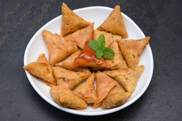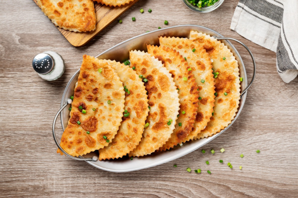 – Тесто поделить на несколько частей, раскатать тонкие лепешечки, положить начинку, защипывать края и жарить на раскаленном масле с двух сторон до золотистой корочки