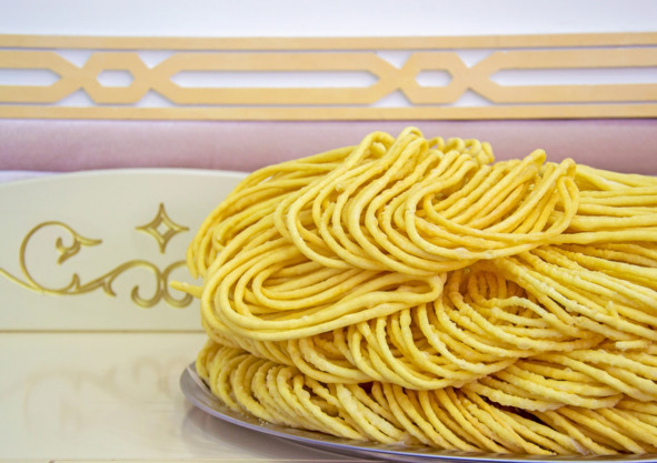 – Третья раскатка – еще тоньше, как на лагман – намотать лапшу на руку, растягивать, ударяя о стол и одновременно тянуть руками