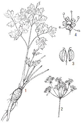 Рис. 18. Петрушка посевная 1 – общий вид растения; 2 – соцветие; 3 – плод; 4 – цветок