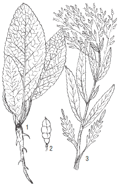 Рис. 19. Хрен деревенский: 1 – корень с прикорневыми листьями; 2 – плод; 3 – верхняя часть стебля с плодами