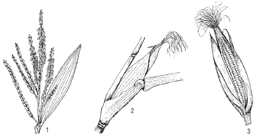 Рис. 20. Кукуруза: 1 – мужское соцветие (метелка или султан); 2 – женское соцветие (початок); 3 – созревающий початок
