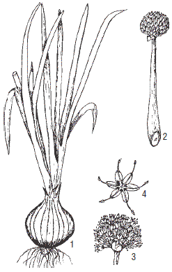 Рис. 21. Лук репчатый: 1 – общий вид растения; 2 – нераспустившееся соцветие на длинном цветоносе; 3 – распустившееся соцветие; 4 – цветок