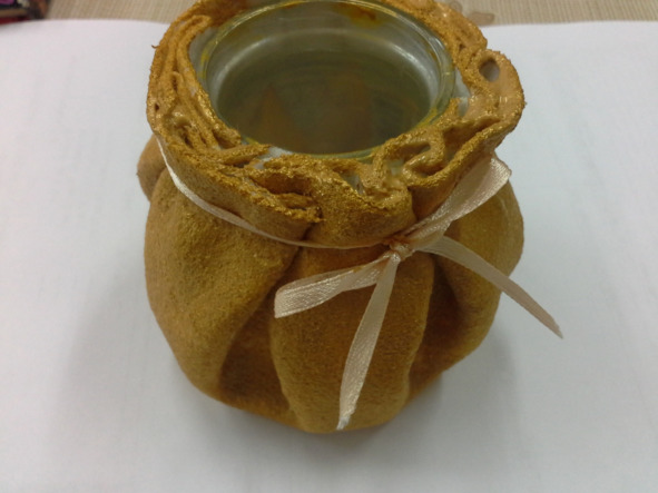 Материалы: фетровая ткань, клей ПВА, пластиковая одноразовая большая тарелка, баночка из под детского пюре, акриловая золотая краска. Кладем тарелку вверх дном на ткань, обводим и вырезаем. В любом пластиковом контейнере разводим клей ПВА и воды (3 части клея на 1 часть воды). Смачиваем вырезанный круг в разведенном клее и отжимаем.