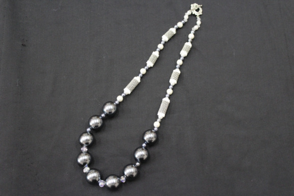 Материалы: бисер серый Чешский №10 -15 гр., бисер белый Чешский №10 -10 гр., леска, бусина мокрый асфальт 2 см. – 9шт, бусины серые 5 мм. – 20 шт., бусины белые 4 мм. – 16 шт., гранёные прозрачные бусины 4 мм. – 10 шт., белые бусины 6—7 мм. – 8шт.