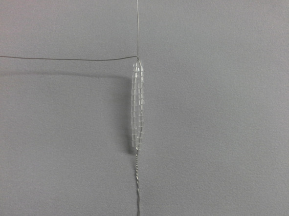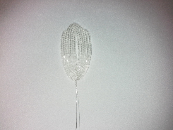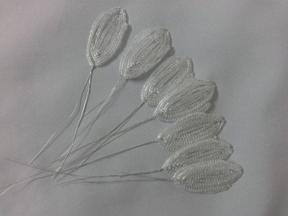проволока для стебля алюминиевая. Из прозрачной рубки плетём большие лепестки в технике французского плетения листа, на центральную ось набираем 15 рубок, плетём 6 пар дуг. В последней паре дуг плетём зубчик, таких лепестков сплетите 21 шт.
